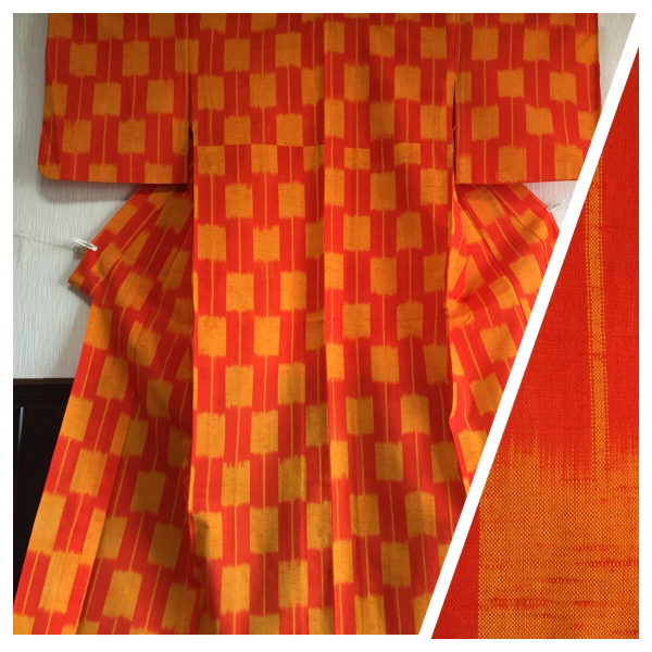 - 【ウールの着物】単 身丈157cm 市松の変形 洗濯済み 柿色と黄色
