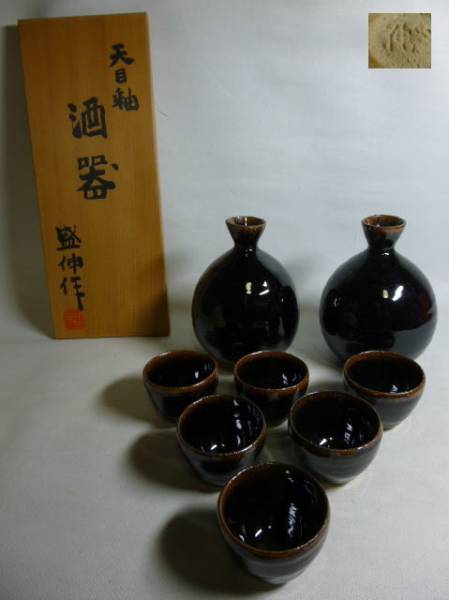- 旧家から 木村盛伸 天目釉 酒器揃え 共箱(徳利2 盃6個)