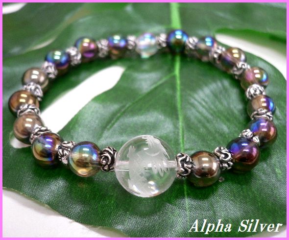 - シルバー925銀パーツ付 天然石8mmブラックオーラ&彫り龍 水晶 数珠ブレス/ラスト1点
