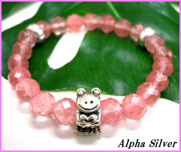 - シルバー925銀パーツ カエルさんビーズ付 8mmチェリークォーツ数珠ブレス 伸縮フリー/ラスト1個