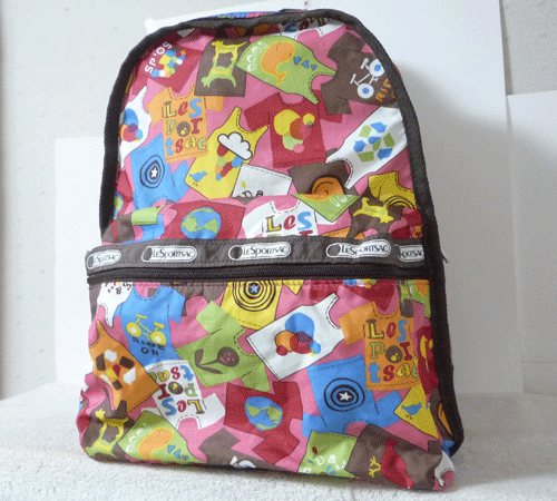> ☆美品☆ レスポートサック LESPORTSAC ナイロン マルチカラーシャツ柄 ダークブラウン系 リュックサック レディース