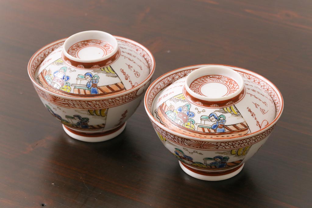 - R-031744 幕末明治期 赤絵染付 味わいある絵柄の蓋茶碗2客セット(和食器)(1)