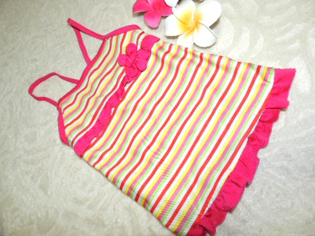 - お花飾り ワンピース水着 95cm ピンク×カラフルボーダー