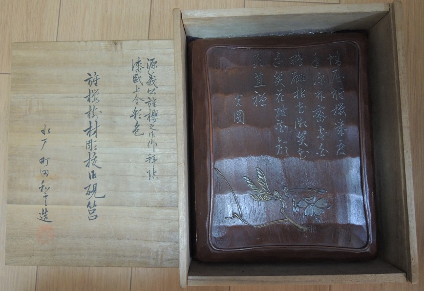 明治時代 水戸彫刻師 町田和雲造 彫桜花 漢詩 源義公 硯箱 煎茶盆 共箱
