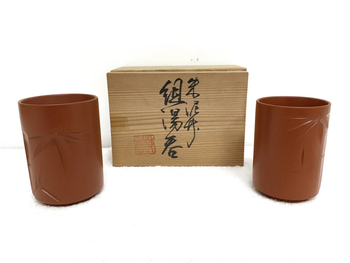 - 未使用品 ◯ 朱泥竹紋組湯呑 夫婦湯のみ 食器 茶器 コップ 陶器 管理 1803 H-11