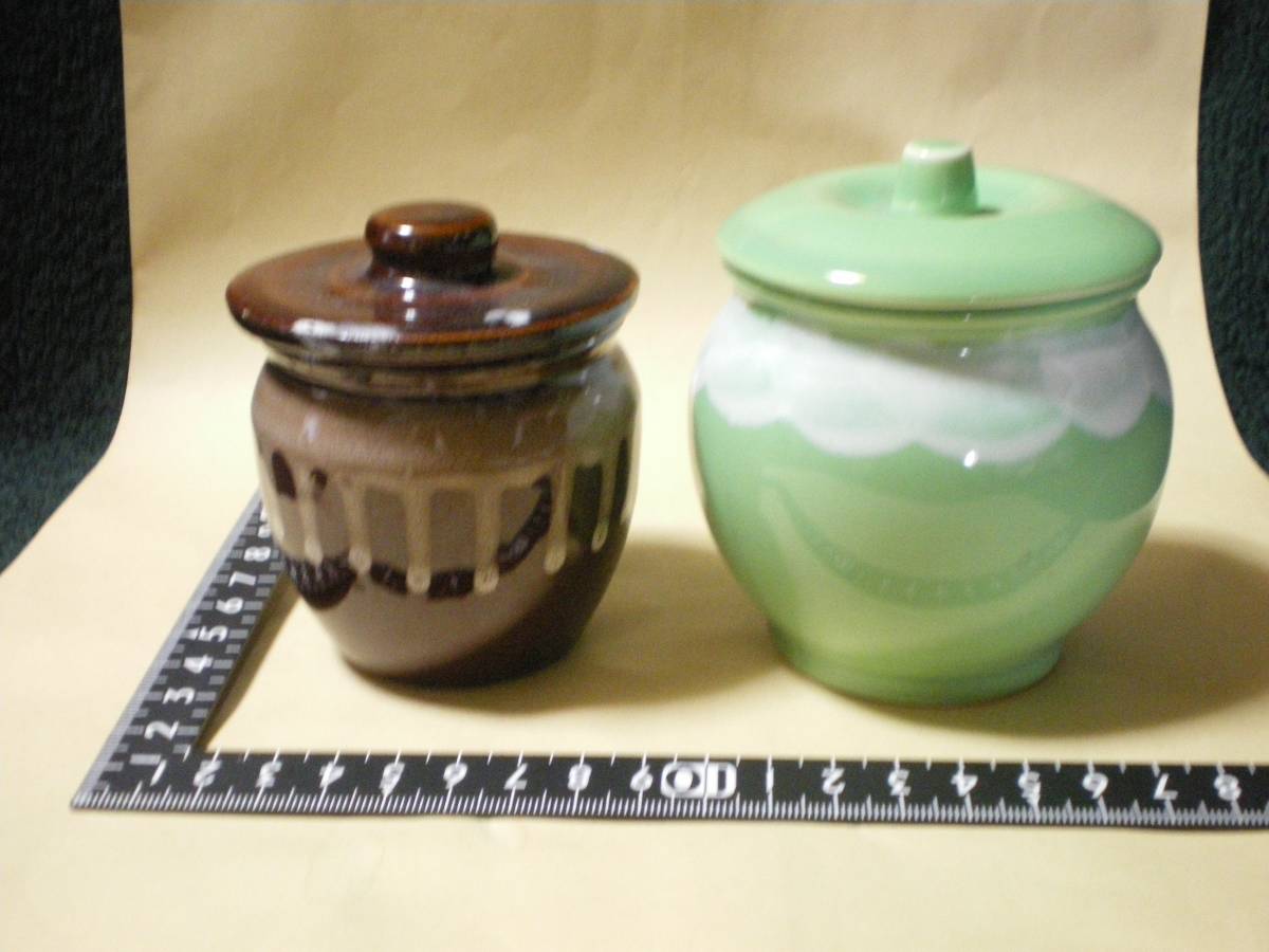 - 珍品フリマ] かめ 甕 蓋付き 梅干保存用 大小2個 大の口径6cm,全高9.5cm 小の口径5cm、全高8cm 大に少々フチ欠けあり[送料無料]