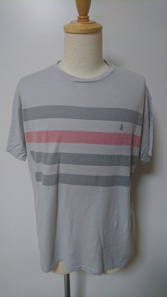 > ☆VOLCOM ボルコム ボーダー柄 Tシャツ ロゴ ワンポイント プリント グレー【M】古着 ◆8649◆