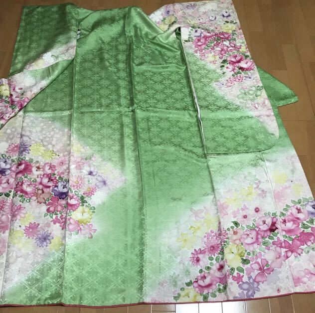- 昭和中期 黄緑色綸子 淡いタッチの花模様が美しい振袖