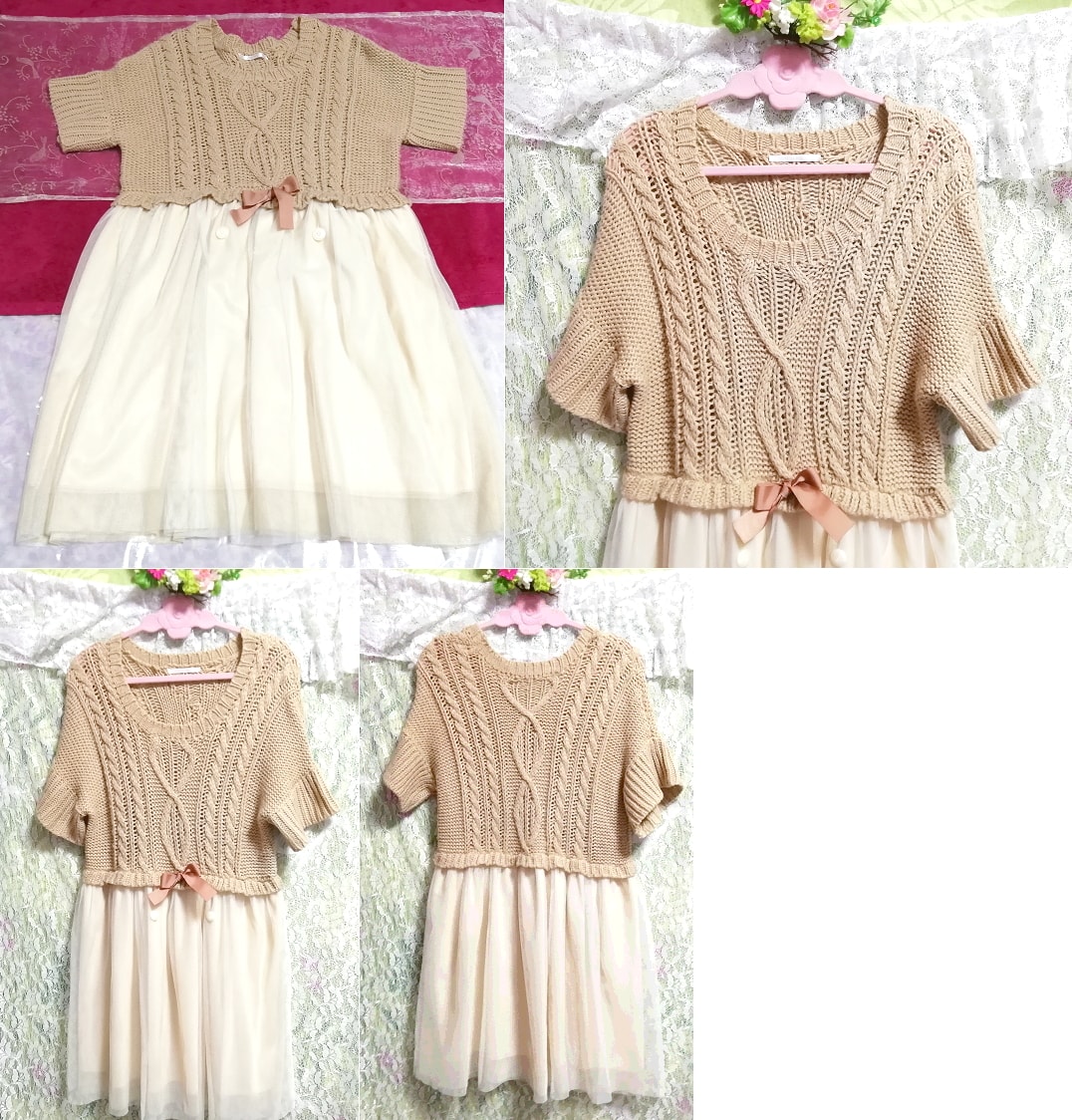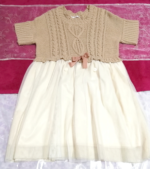 > 茶ニットフローラルホワイトチュールスカートネグリジェワンピースセーター Brown knit floral white tulle skirt negligee dress sweater