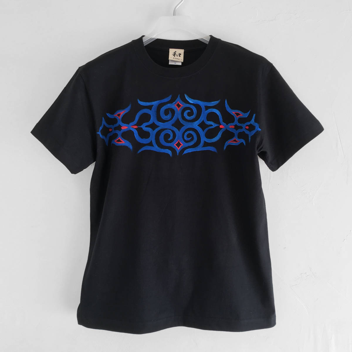 > メンズ 文様唐草とフクロウ柄Tシャツ Mサイズ ブラック 手描きで描いたアイヌ文様のTシャツ 和柄