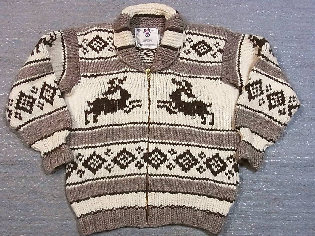 - カウチン・カーディガン セーター ジップアップ・Lサイズ位 トナカイ柄 NATIVE・INDIAN・KNITカナダ製CA07322