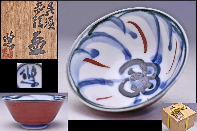 > 近藤悠三 ★ 呉須赤絵ぐい呑 ★ 共箱 ★ 人間国宝 ★ スピード感のある胴の赤に見込みの絵付が愛らしい逸品 ★検 近藤豊 近藤濶 ★