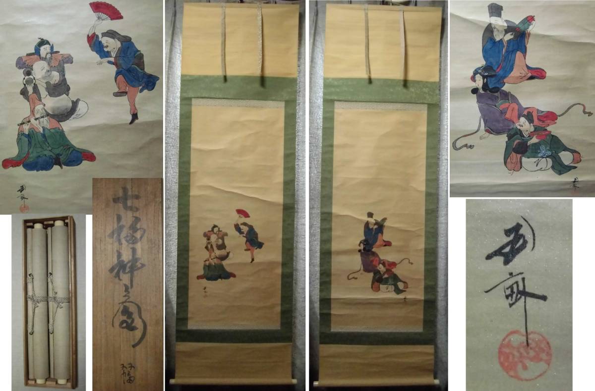 - 古い 掛軸 七福神之絵 玉畝 二幅(双幅) 共箱入り 木箱 絹本 肉筆 日本画