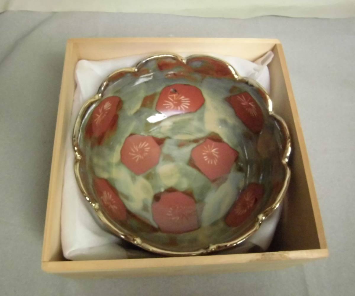 - 菓子鉢 晃峰作・深鉢 ボウル 陶器 三角穴透かし入り・未使用