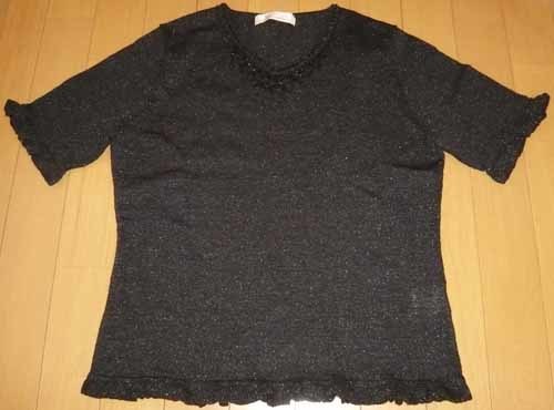 - ViaAmoiアモイ◆ラメ◆黒ビーズ&スパンコール◆Vネック半袖セーター☆裾ふりふり【ユーズド】M