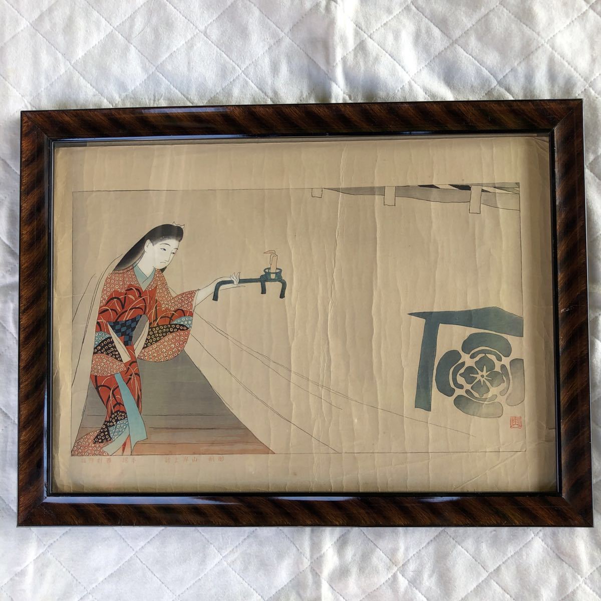 > アンティーク、日本画 木版画 美人画 。石川寅次の木版画。彫刻。山岸主計。手摺。西村熊吉。横幅42.5センチ。立て29..5センチ。保証。