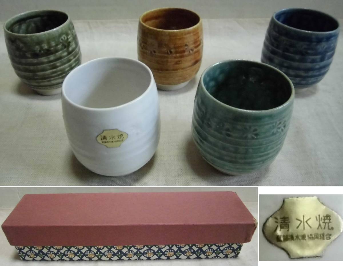 - 味わい有る お猪口 清水焼 色違い 5客 箱入り 三島 薄手 白磁 酒器 ぐい呑み 盃 杯 工芸品 陶器 レトロ