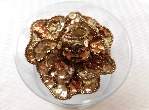 - 値下げ/美品ブロンズの華/金色スパンコール.ビーズのコサージュ/ブローチ/カメリア/バラの華