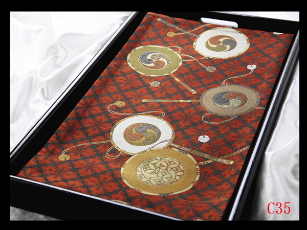 - C35厳選西陣 手織 典雅な縫いの表情 花菱に三つ巴鼓文極上逸品蘇芳地 六通高級正絹純金糸美術袋帯 検◇簪名古屋帯締め