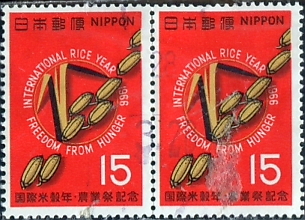- □■1966年国際米穀年記念15円切手横2連=使用済