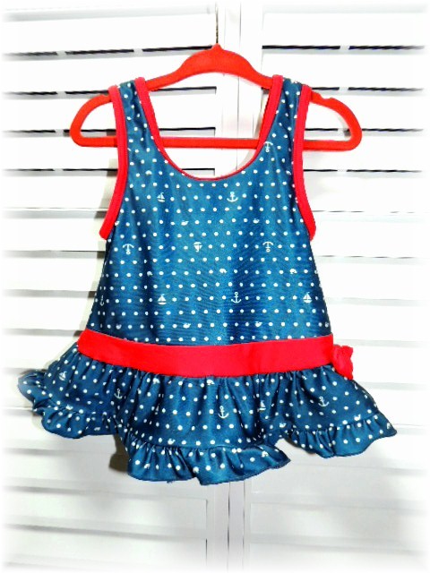 - マリンスタイル ワンピース水着 べビー90cm ネイビー×ホワイト水玉 所々ヨット・イカリ柄