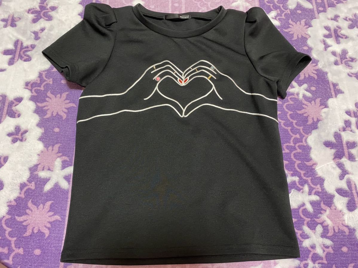 > ワンスポ one spo 半袖Tシャツ パフスリーブカットソー トップス 推しハートマーク イラスト アクセサリー ブラック 黒 キラキラストーン
