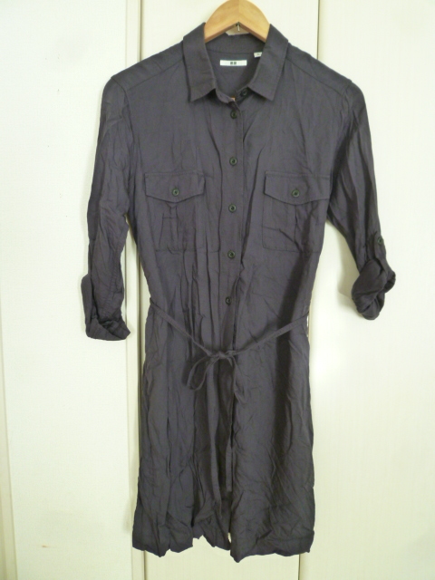 - UNIQLO/ユニクロ△濃いグレーウエストリボンとろみシャツワンピースM/ミリタリー系サファリ系長袖2WAY袖膝丈△24
