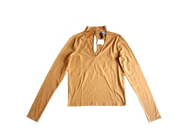 > 新品 H&M ハイネック V開き トップス S キャメル 長袖 無地 ストレッチ エイチ&エム 小さいサイズ