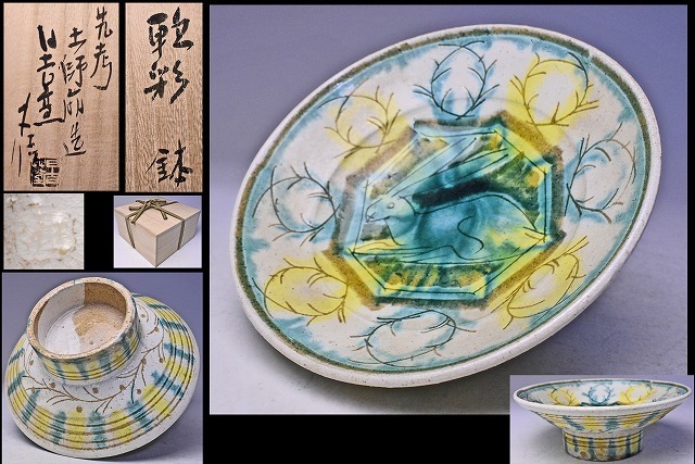 - 加藤土師萌 ★ 軟彩鉢 ★ 加藤丈佳識箱 ★兎文★人間国宝 土師萌氏が命名した『軟彩』 ★ 淡い色合い ★ 白化粧掻き落とし ★ 菓子鉢に