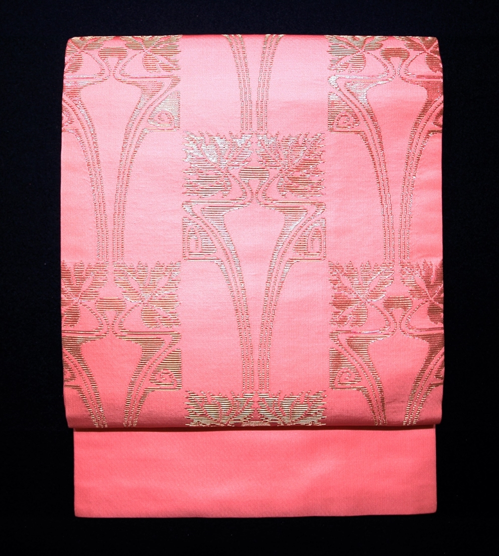 > 花とら★値下げしました★ ●リサイクル帯 名古屋帯 たつむら ベルヤン 逸品 ピンク モダン 210414