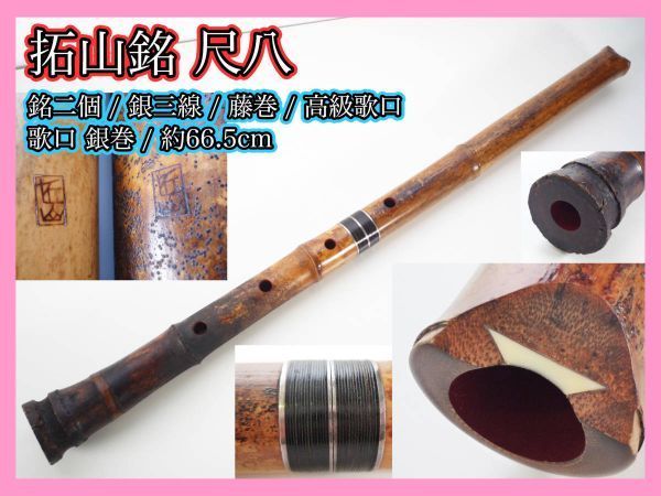 > 旧家蔵出 高級尺八 拓山 銘二個 尺八 銀三線 黒藤巻 歌口銀 高級歌口 刻印 在銘 約66.5cm 中継 竹製 艶感 伝統狂言雅楽能骨董 M3(検:真山