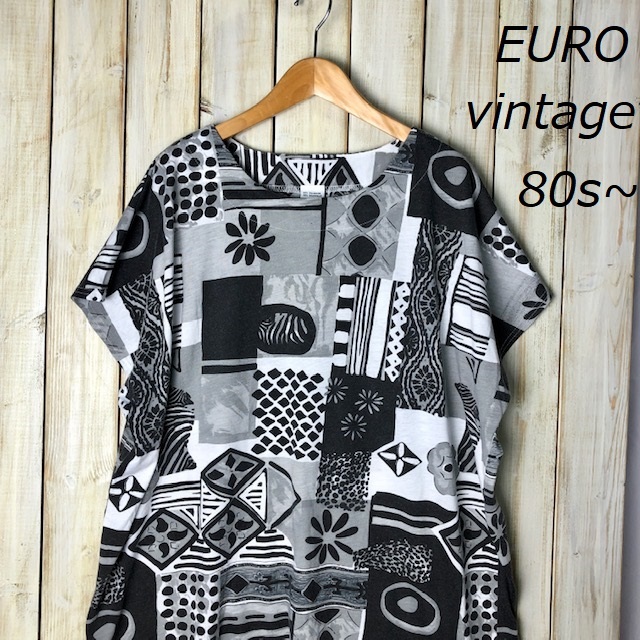 > euT●32 EURO古着 80s~ ヴィンテージ モノトーン総柄 ワイドカットソー XL~ ヨーロッパ古着 オールド ユーロ Tシャツ