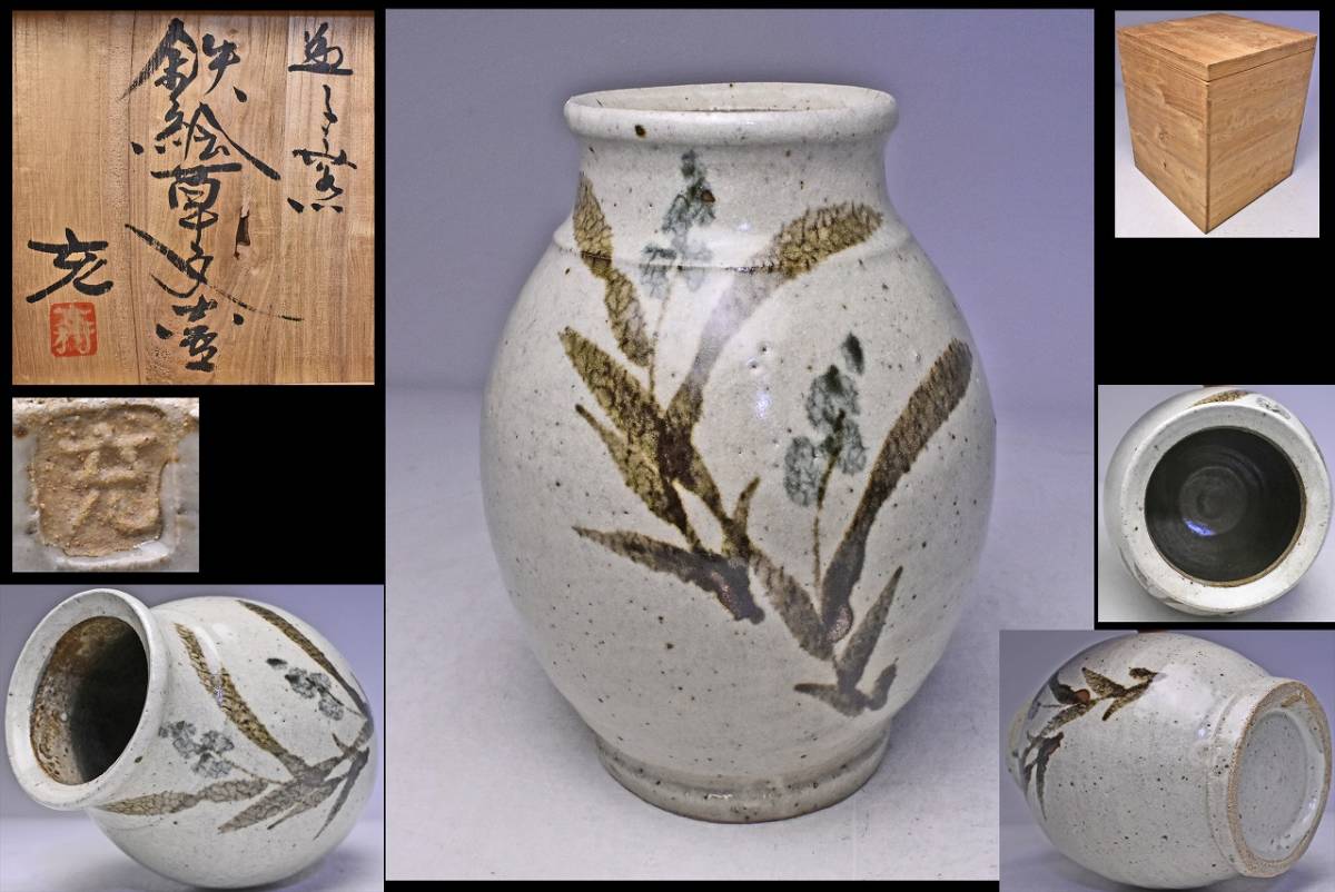 > 木村充 ★ 鉄絵草文壷 ★ 共箱 ★ 呉須 ★ 益子焼 ★ 木村一郎 木村充良 縁 ★ 花入 ★ 花器 ★ 花瓶 ★ 物故作家 ★
