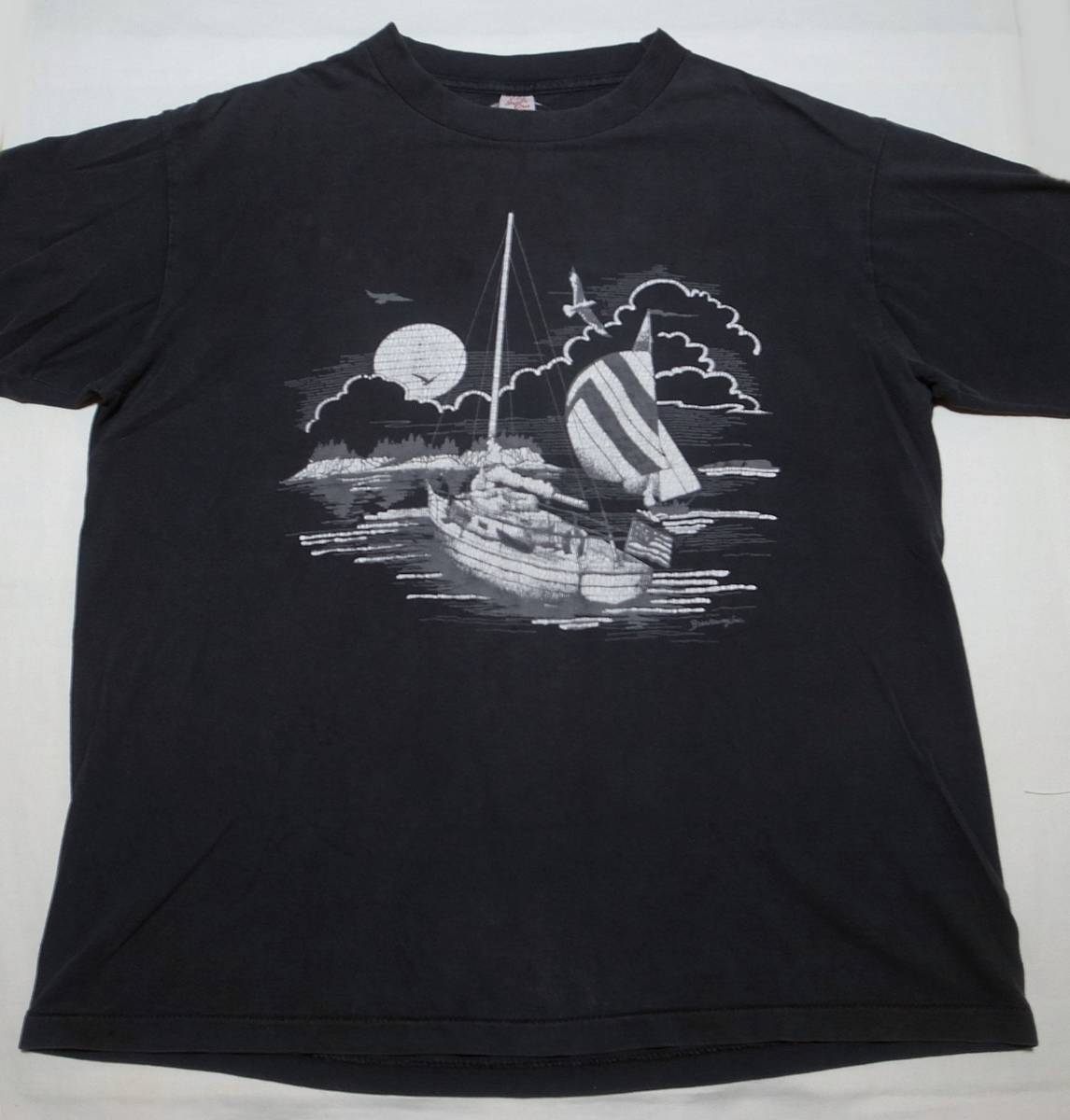 > MADE IN USA 90s ヴィンテージ Tシャツ 丸首 黒 XL 古着 船 アート 古着男子 vintage tee black 古着 Tシャツ