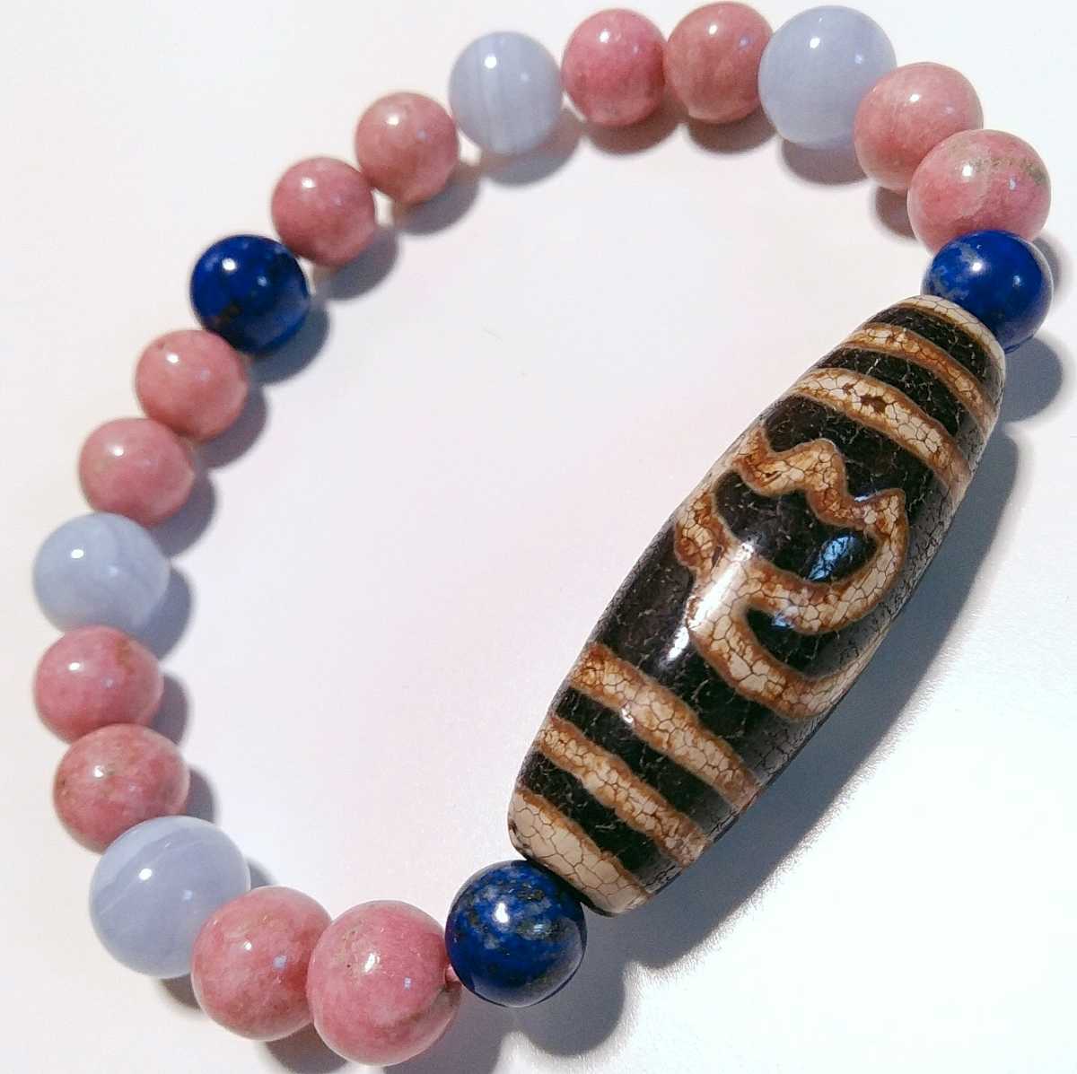 - 蓮花天珠×ロードナイト×ブルーレースアゲート×ラピスラズリ デザインブレスレット 18cm