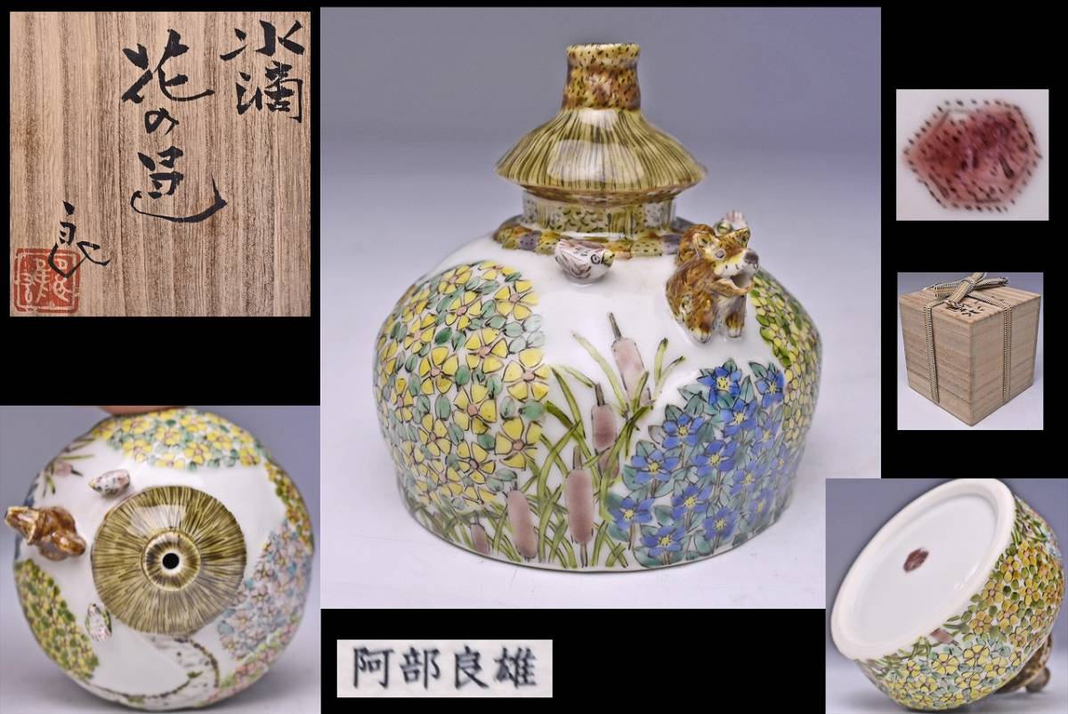 - 阿部良雄 ★ 色絵 『花の邑』 水滴 ★ 共箱栞 ★ 犬 細工物 ★ 書道具