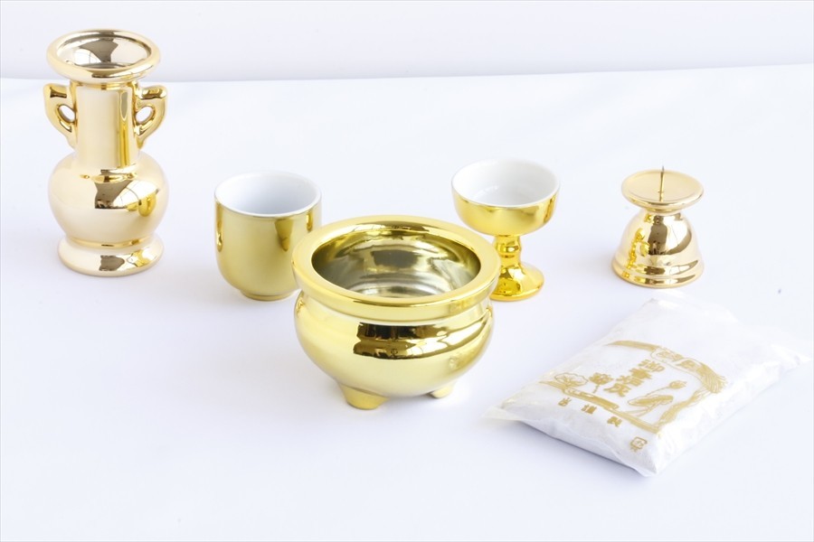 - 国産 仏具 セット ■ 金メッキ ■ 陶器 5点+香炉灰 ■ モダン・ミニ仏壇に ■ お盆 お彼岸 お墓参り 供養