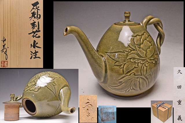- 久田重義 ★ 灰釉 刻文 水注 ★ 共箱 共布 栞 ★ 曜変天目 研究 ★ 耀州窯 を思わせる気品ある逸品 ★