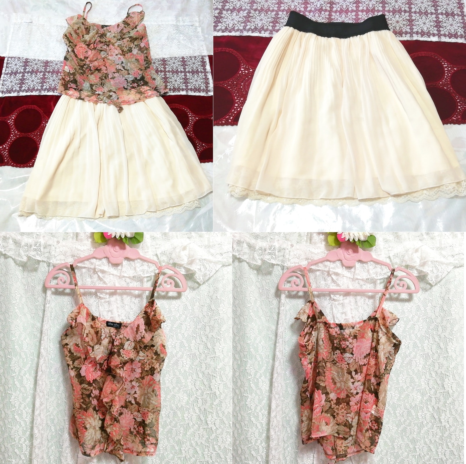 - 茶色ピンクシフォンキャミソール ネグリジェ フローラルホワイトスカート 2P Brown pink chiffon camisole negligee floral white skirt