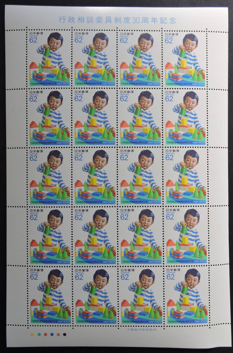 > 日本切手ー未使用美品 1991年行政相談委員制度30周年切手62円*20枚 1シート 添付切手の発売説明1枚(切手ではない!)