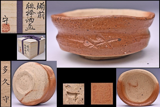 > 多久守 ★ 備前 緋襷 ぐい呑 ★ 共箱 共布 栞 ★ 師:木村隆明 ★ 山盃の様な平盃ですが胴にしっかりと窪みが造形された手取りの良い逸品