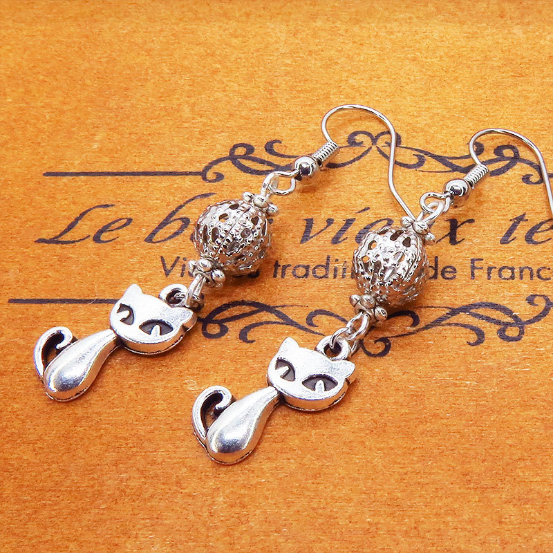 - アンティークシルバーの猫とメタルビーズのシンプルなピアス イヤリング