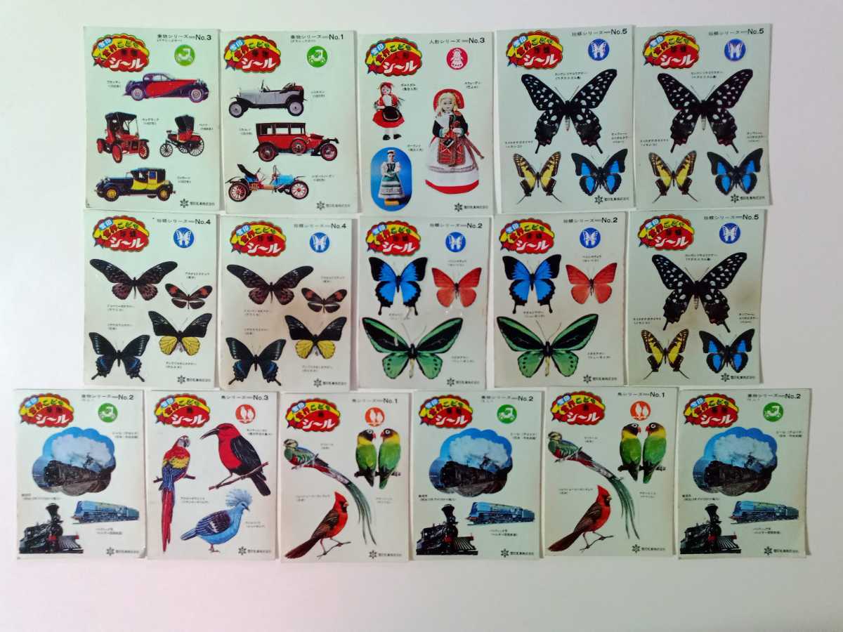 - 【ビンテージ】★16枚セット★雪印★世界こども乗物シール★珍蝶★人形★鳥★レトロ★アンティーク
