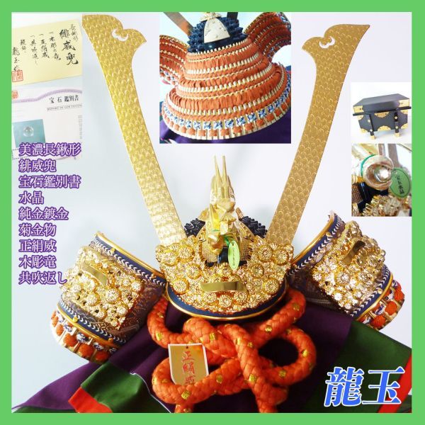 - 新品 最高級 龍玉作 美濃長鍬形 緋威兜 兜飾り 甲冑 宝石鑑別書 保証書 水晶 純金鍍金菊金物 正絹威 木彫竜 共吹返し 20号 戦国武将 豪華38