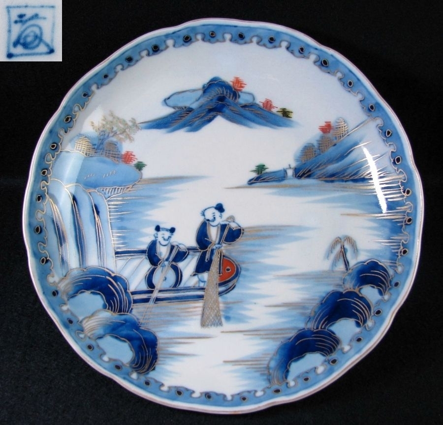 - 時代 染錦 金彩 山水人物文8寸皿 No4 幅:25cm 渦福銘 明治~大正/21b031