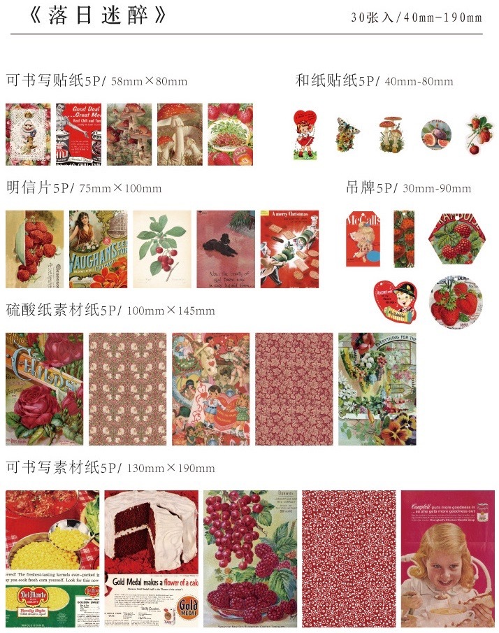 > ◆海外 素材紙・シールセット メモ 背景紙 No8-2 赤色系 デザート おすそ分け・手帳・日記・ジャンクジャーナル・コラージュに