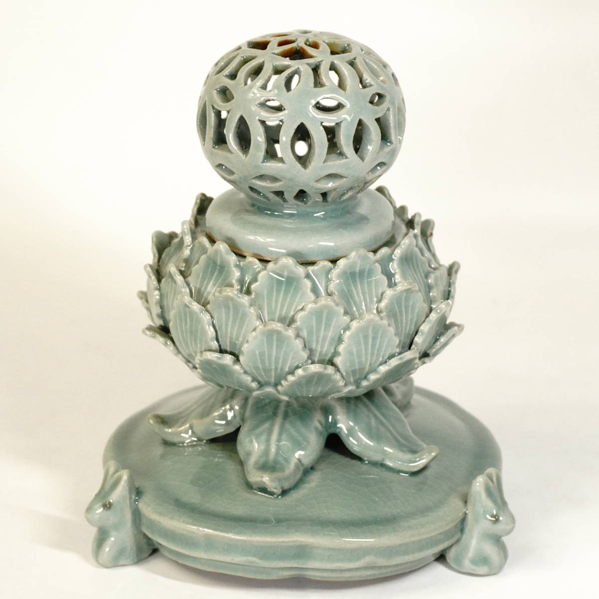 - 韓国 高麗青磁 海青作 透彫摘蓋蓮型兎三足香炉 直径14.5㎝ 高さ16.5㎝ 造形が美しい逸品! ※一箇所欠けあり TKM