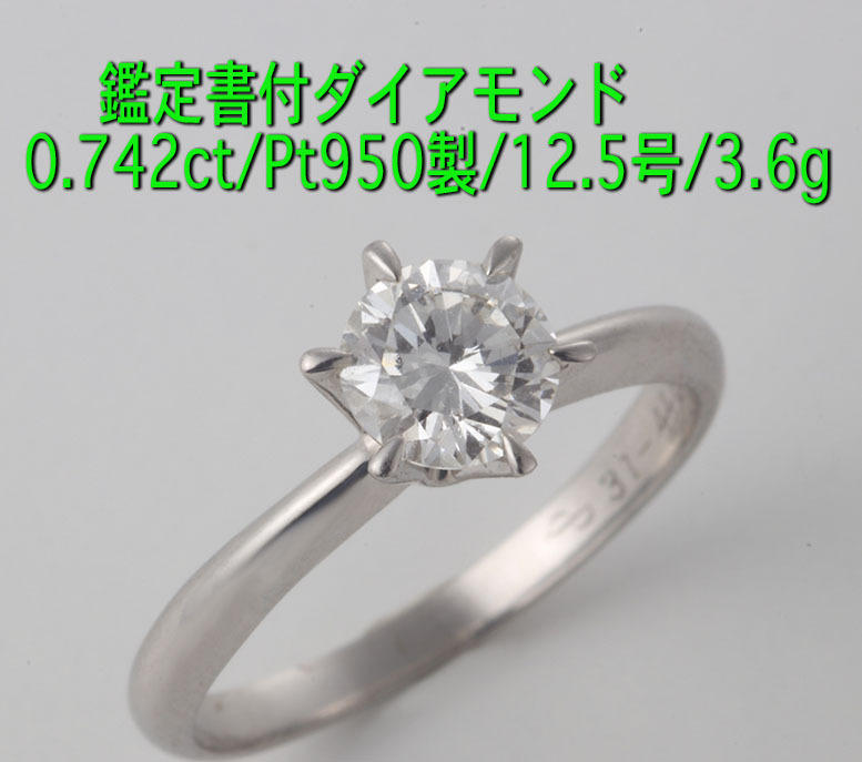 [[全ての商品に品質保証カードが付きますのでご安心ください]] 高島屋デパートで購入されたリングです。高島屋発行の鑑定書が付属しております。0.742ct/V V S-1/Hcolor/Very Good cutと表記されています。当方所属鑑定士からの報告では、ちょっと評価が下がっています。カラーは I /カットはGood/クラリティは同じでV V S-1評価でした。それでも0.7ct以上のダイアでV V S-1のダイアですから極上のダイアモンドだと云えます。市販想定価格は70万円以上で、デパートでしたら100万円を超えるかも知れません。代々使っていけるものですからこの機会に如何でしょうか。,