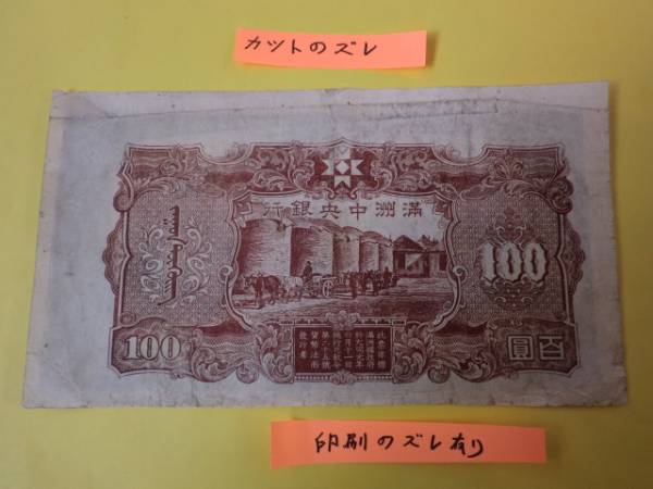 - 裁断ズレエラー ★ 満州中央銀行券 丙号券100円 ★ No.15