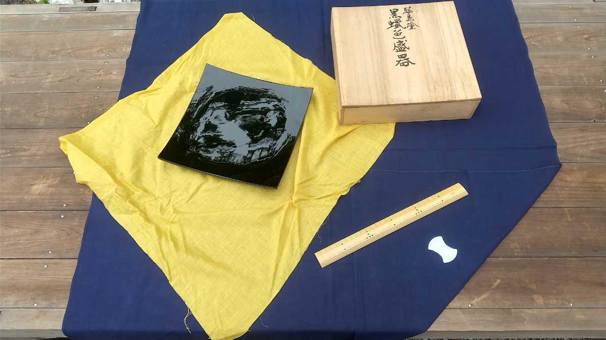 - 輪島塗 黒蝋色盛器 共布 共箱 サイズ(縦横23.5㌢高さ4㌢重さ300㌘)